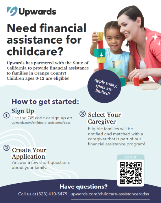 - If you are a home-based childcare business needing technical assistance, please call Upwards at (714) 364-0760