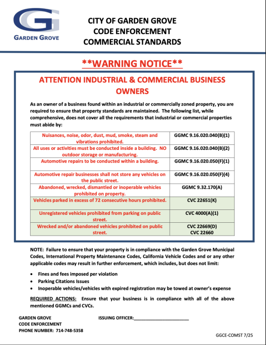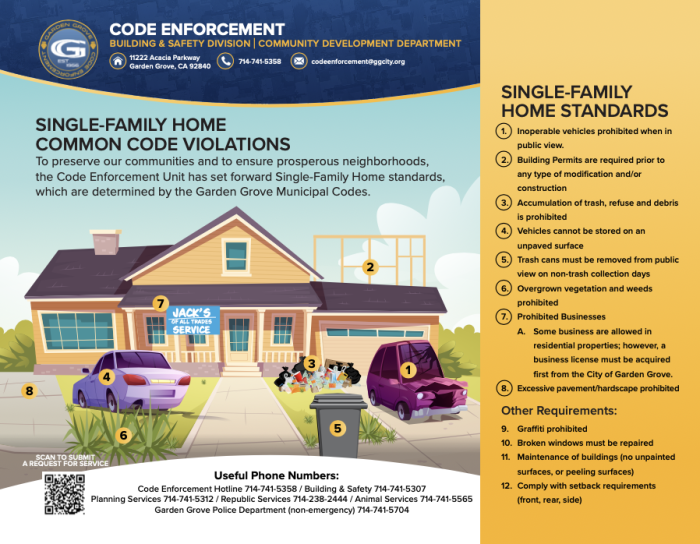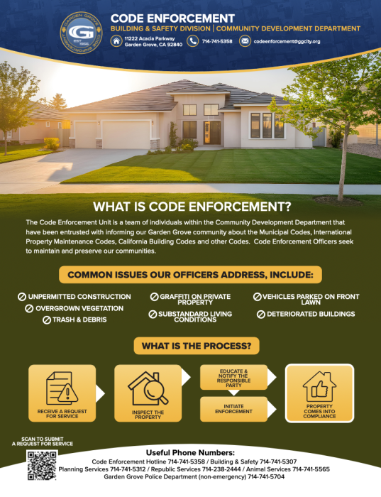 The Code Enforcement Unit is a team of individuals within the Community Development Department that have been entrusted with informing our Garden Grove community about the Municipal Codes, International Property Maintenance Codes, California Building Codes and other Codes. Code Enforcement Officers seek to maintain and preserve our communities.