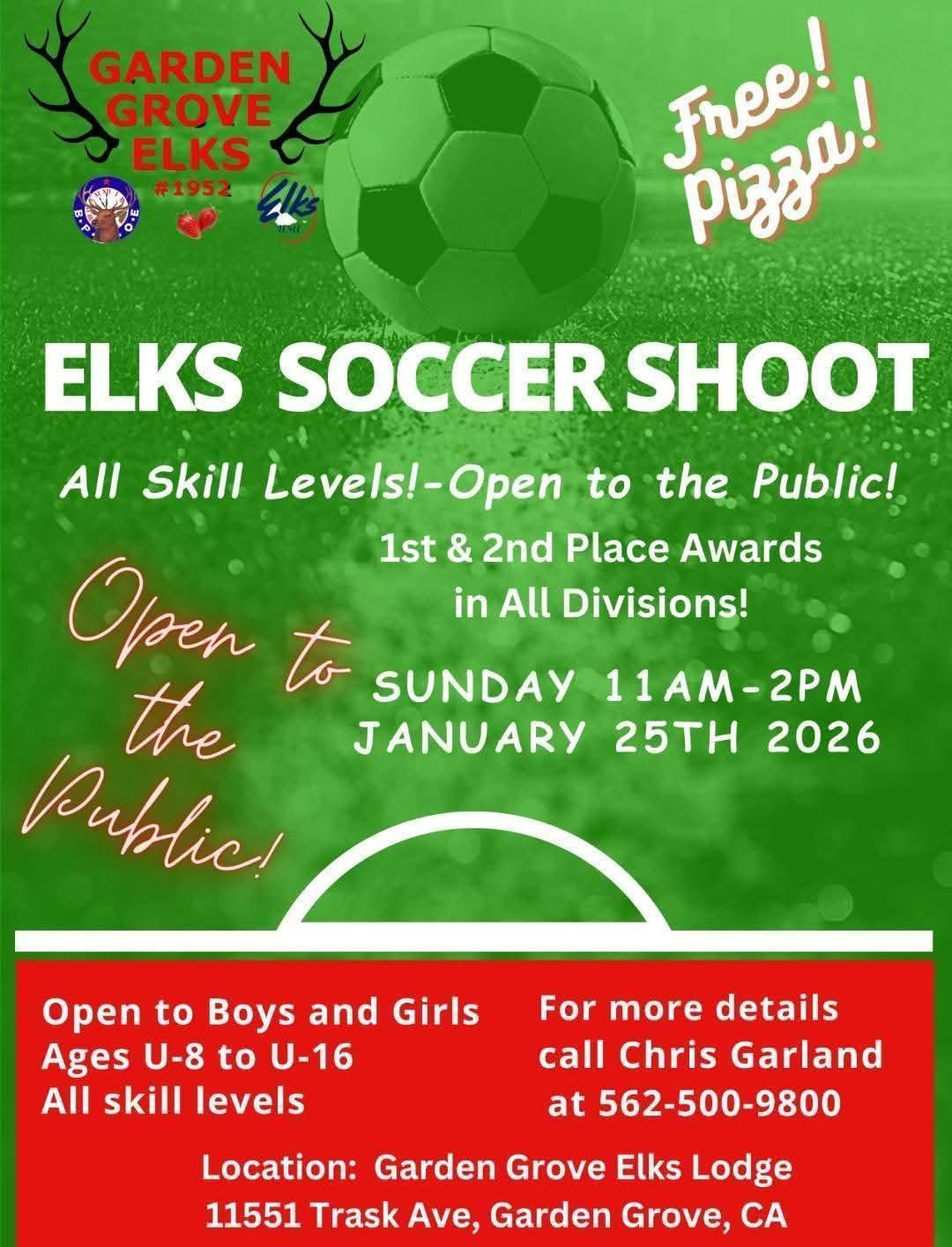 Elks Soccer Shoot Jan 25 Date: January 25, 2026 Time: 11:00 a.m. to 2:00 p.m. Address: Garden Grove Elks Lodge #1952 11551 Trask Avenue United States