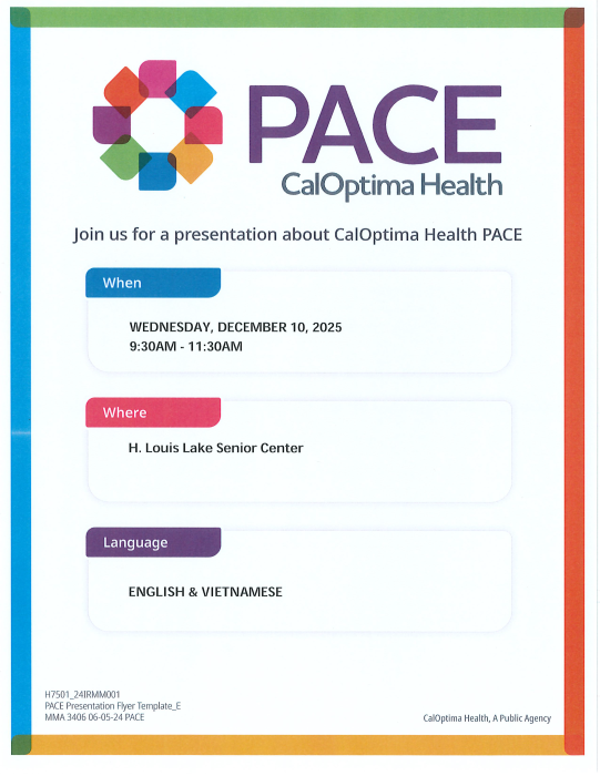 Join us on Wednesday, December 10 from 9:30am - 11:30am for a presentation and tabling event regarding the services provided by CalOptima PACE. To register for the presentation or get more information, call the Center at (714) 741-5253.