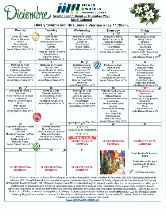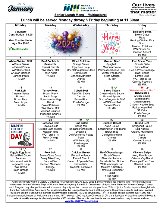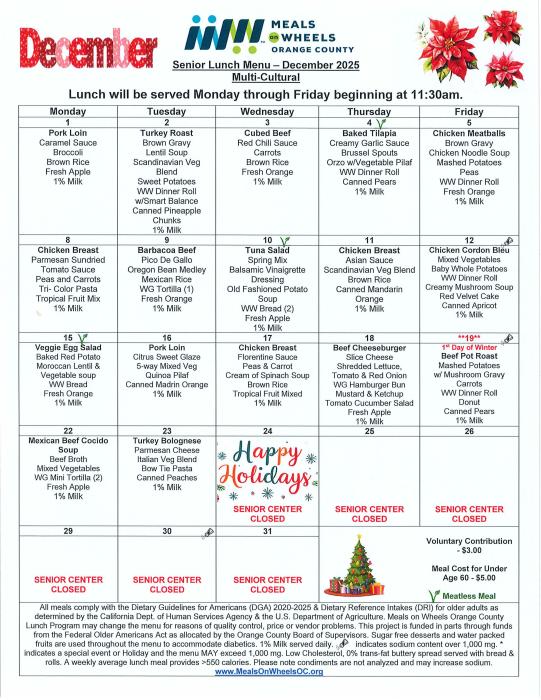 The hot lunch indoor dining program is currently being offered Monday through Friday at 11:30 a.m. Meals are served on a first come first serve basis, with registration for the day’s lunch being done in person at the H. Louis Lake Senior Center (11300 Stanford Avenue) beginning at 8:30 a.m. Adults age 60 and over are eligible to receive meals. Menus are available and are subject to change. For more information please contact us at the senior center at (714) 741-5253.