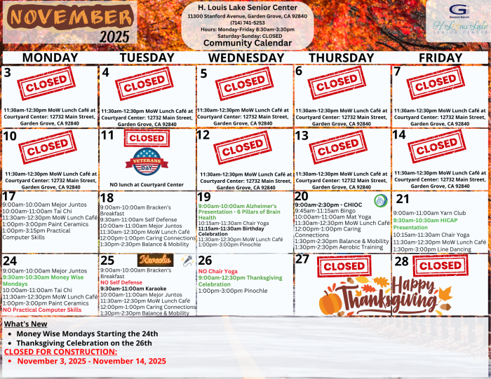 Special Events H. Louis Lake Senior Center Special Events Upcoming Special Events Halloween Movie Day Halloween Dance Halloween Cookie Workshop Closure Notice Community Calendars October 2025 November 2025