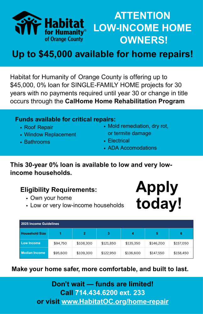 Habitat OC has been granted $2.7 million for our CalHome Program for low and very low-income homeowners earning 80% or less of the county median income.