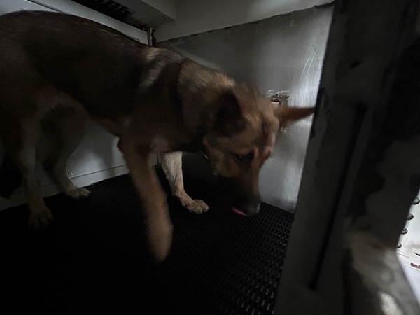 MALE GERMAN SHEP TYPE DOG BLACK AND BROWN WITH BROWN LEATHER COLLAR NO CHIP