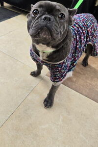 FEMALE FRENCHIE TYPE DOG GRAY IN COLOR WITH NO CHIP WEARING A SWEATER